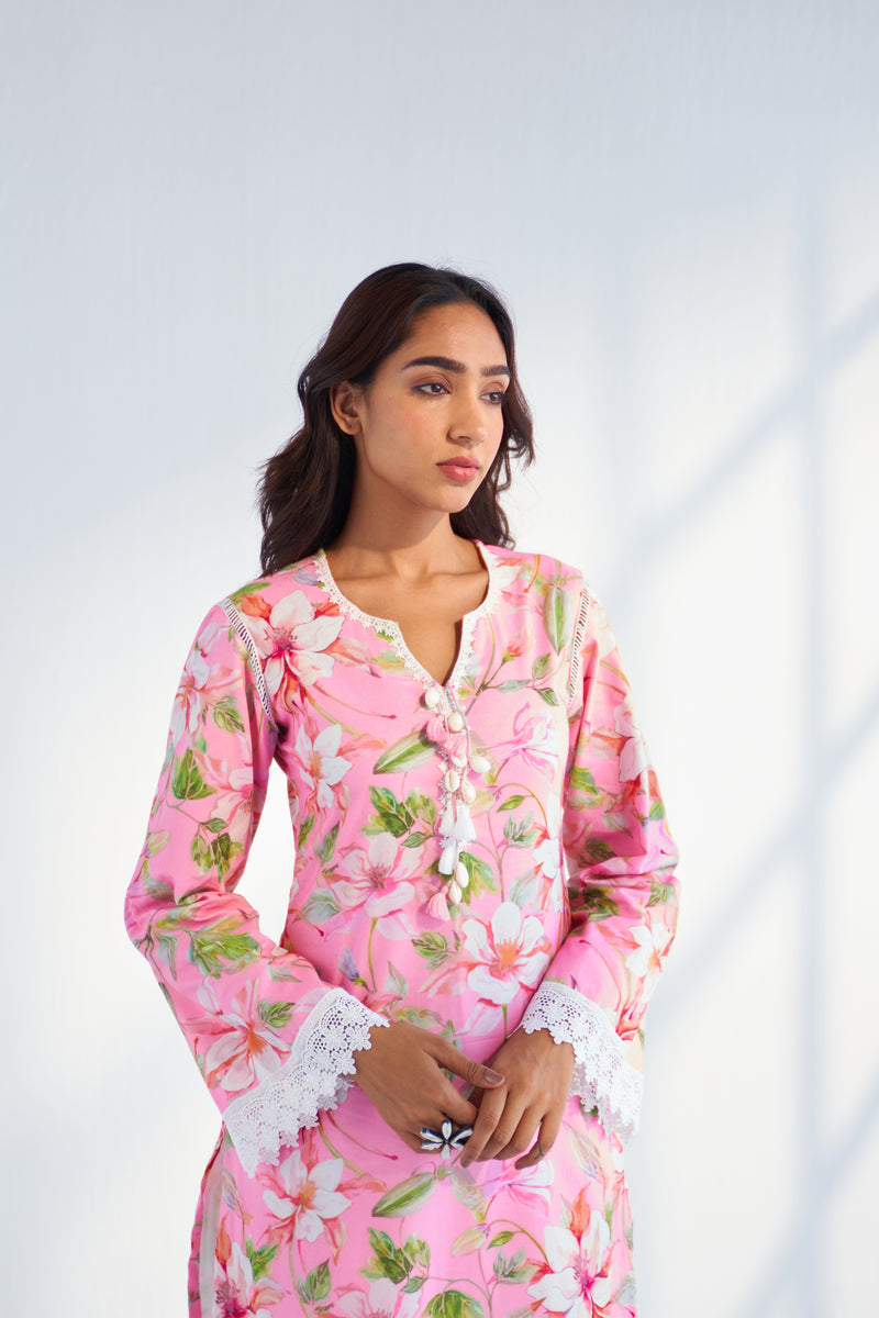 Adorned in hues of pink with soothing prints, an asymmetrical kurta, detailed with charming lacework and playful tassels - what a pick to make a statement of style and comfort this summer!