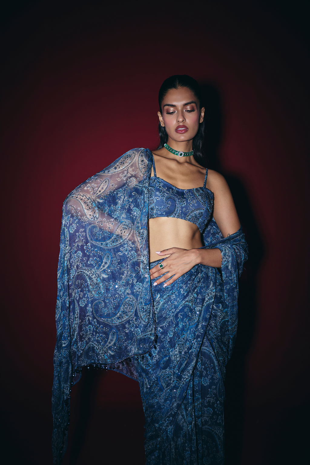 Iraaya comes pre-draped for effortless wear. Chiffon that falls fluidly, a midnight-blue paisley that feels elegant without trying, and hand-embellished details that add just the right festive sparkle.