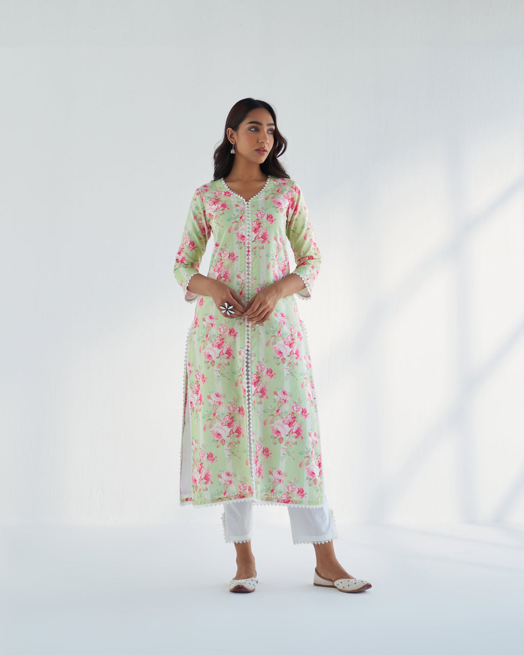 A warm green hue, with a pop of pink florals - there is a unique kind of freshness wrapped in comfort in this kurta set - perfect to step into spring summer in style!