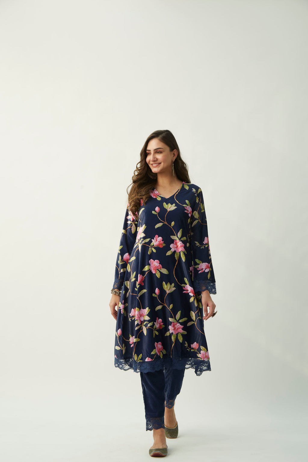 - Kurta : Dark blue printed velvet kurta with lace detailing