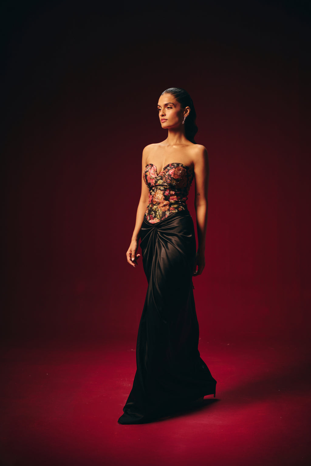 An easy black draped skirt that flows effortlessly, balancing elegance with bold simplicity.