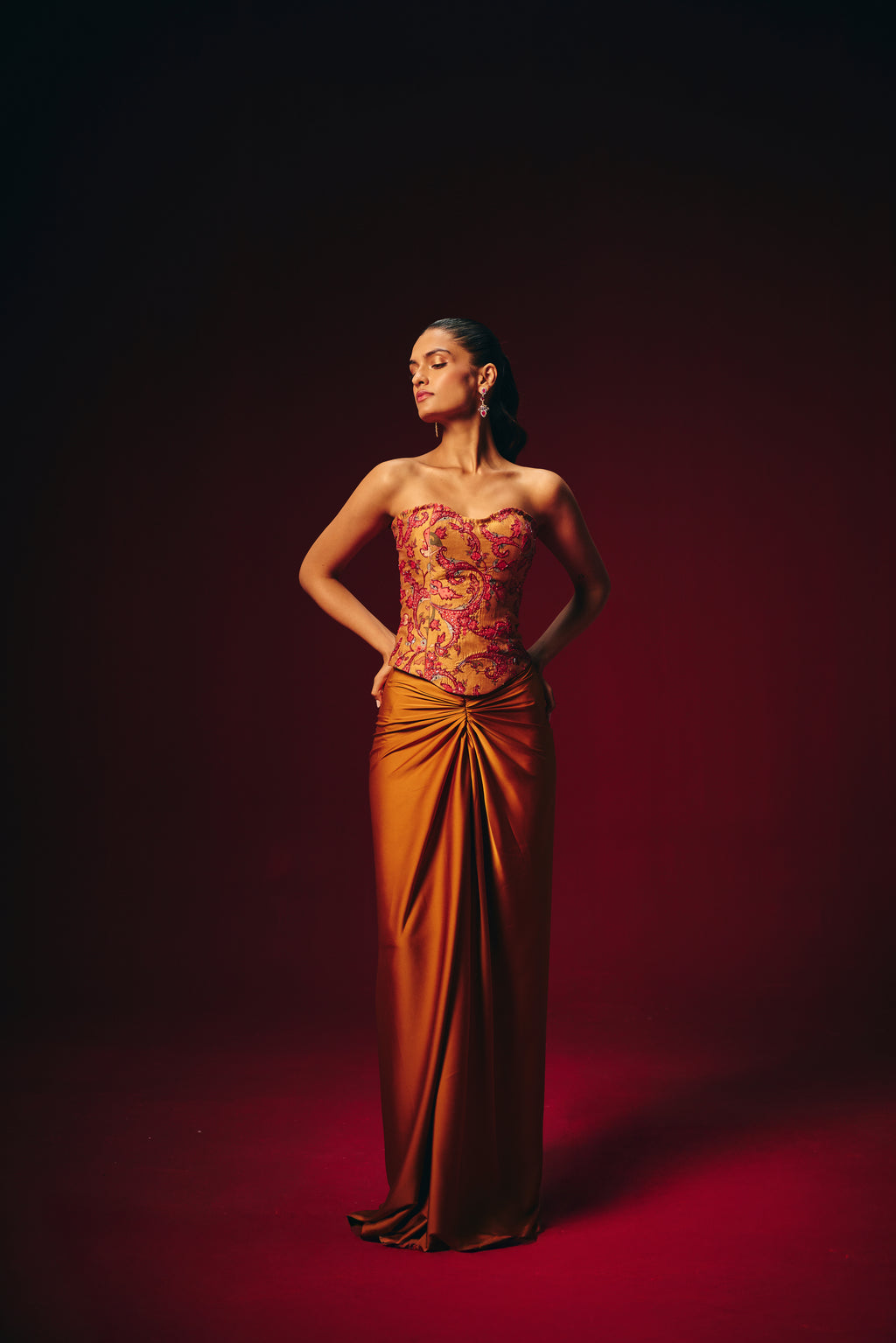 A hand-embroidered chanderi corset in mustard gold that glows with festive warmth and subtle luxury.