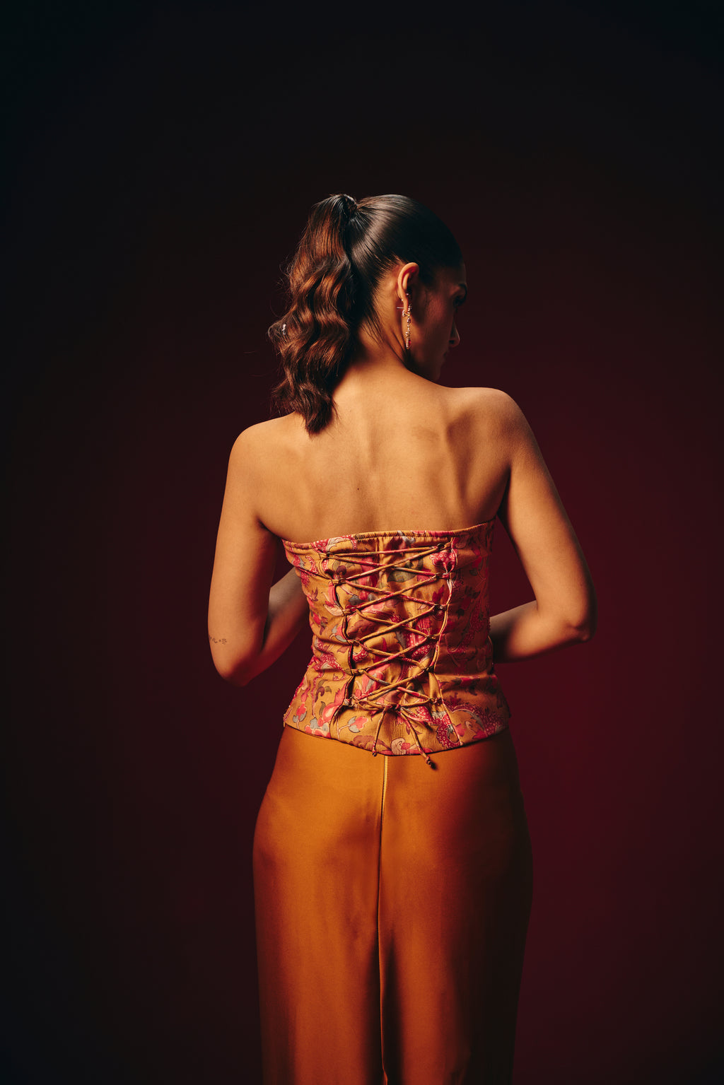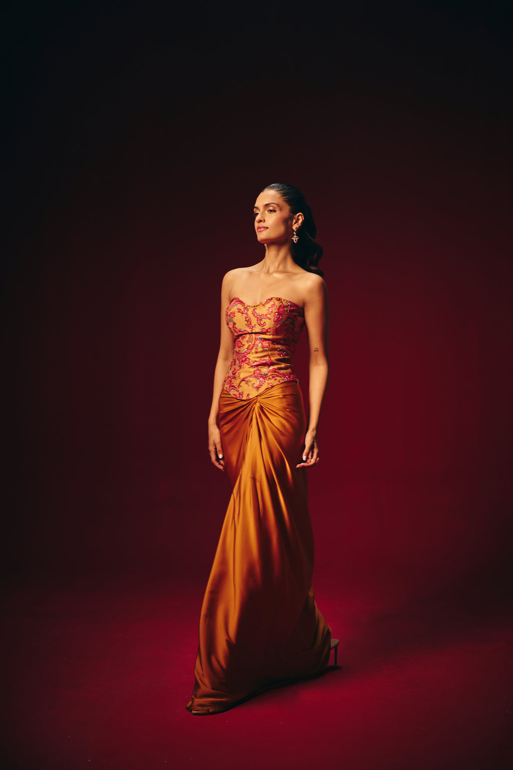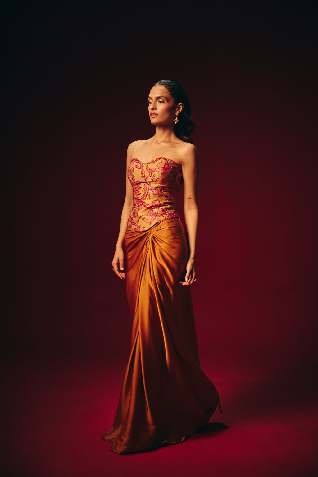 A soft satin draped skirt in mustard gold that feels rich, fluid, and easy to style for any festive occasion.