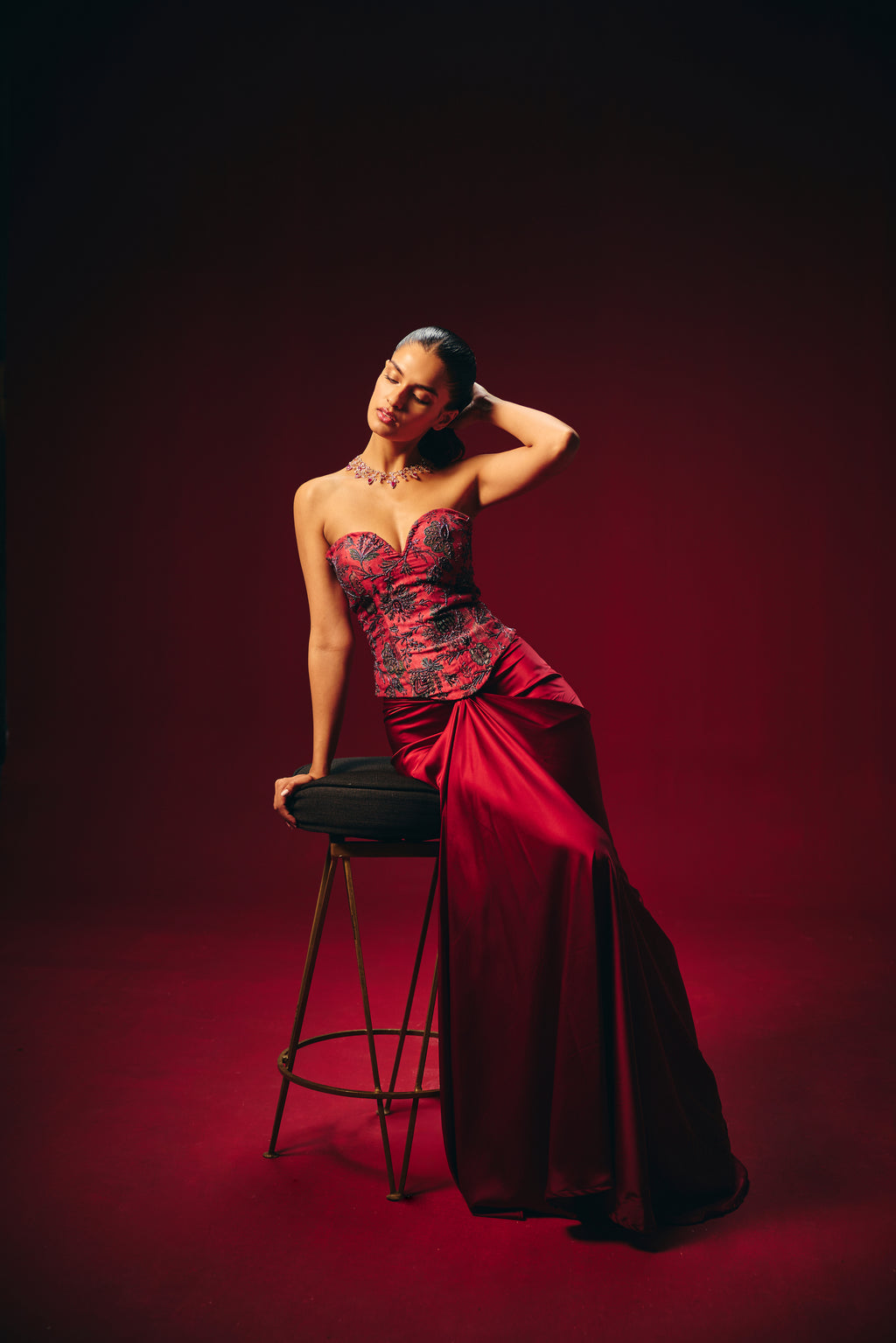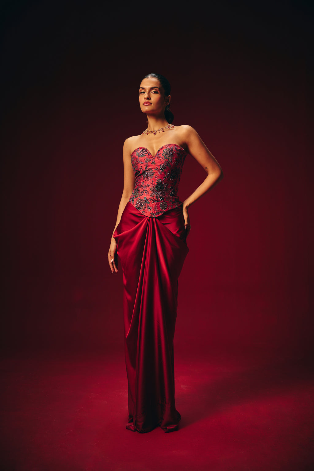 A fitted corset with soft hand embroidery in deep red bold, elegant, and effortlessly flattering.